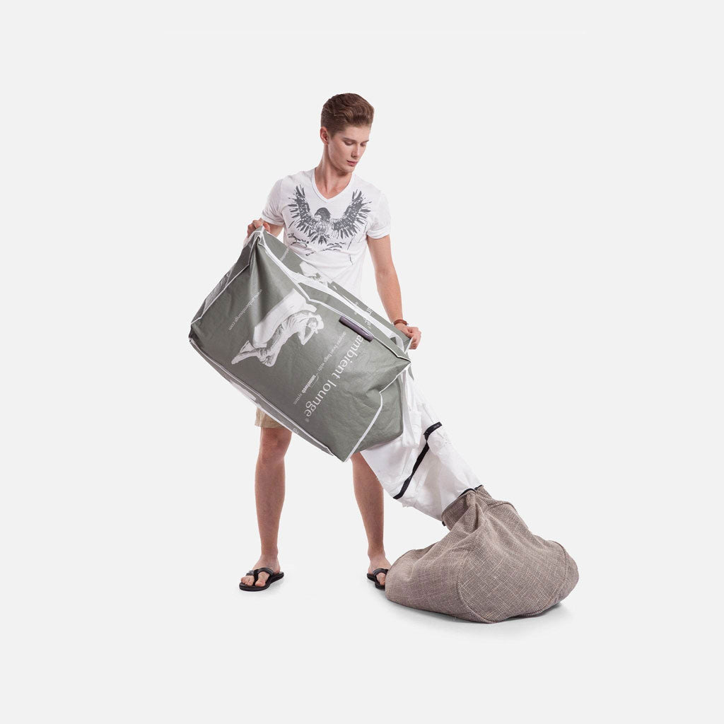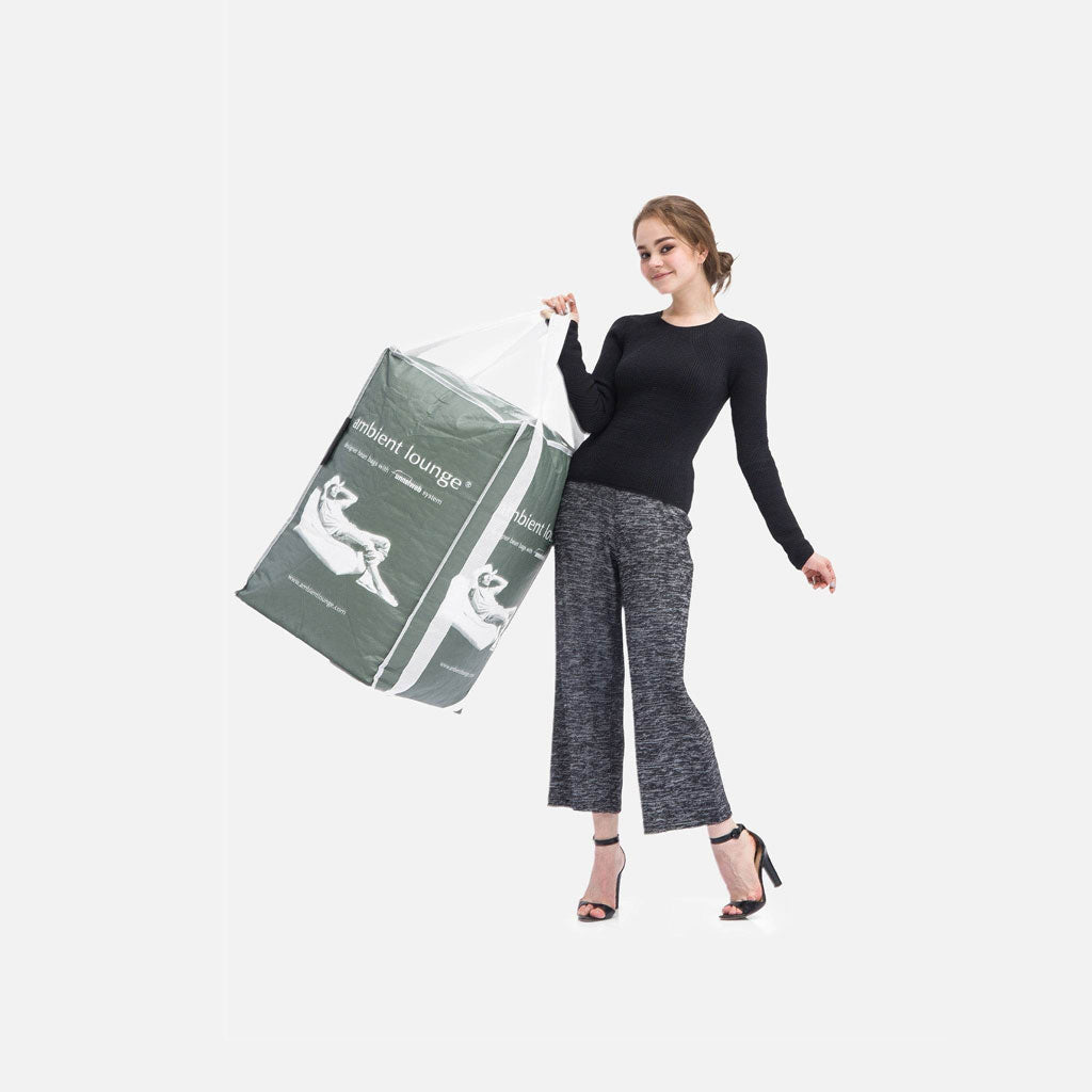Sinun ei enää tarvitse raahata massiivisia pusseja ostoskeskusten ympäri, levittää papupussin papuja ympäri kaunista kotiasi, rikkoa muovipusseja ja saada puolet perheestäsi auttamaan sinua täyttämään tai täydentämään papupussia. Ambient Lounge papupussin täyttö tulee patentoituna Funnelweb ™ Zip & Tips -järjestelmänä, joka toimitetaan ympäristöystävällisessä uudelleenkäytettävässä kuljetuspussissa suoraan ovelle. Se on yhden henkilön työ, joka on nopea, kätevä ja helppo.
