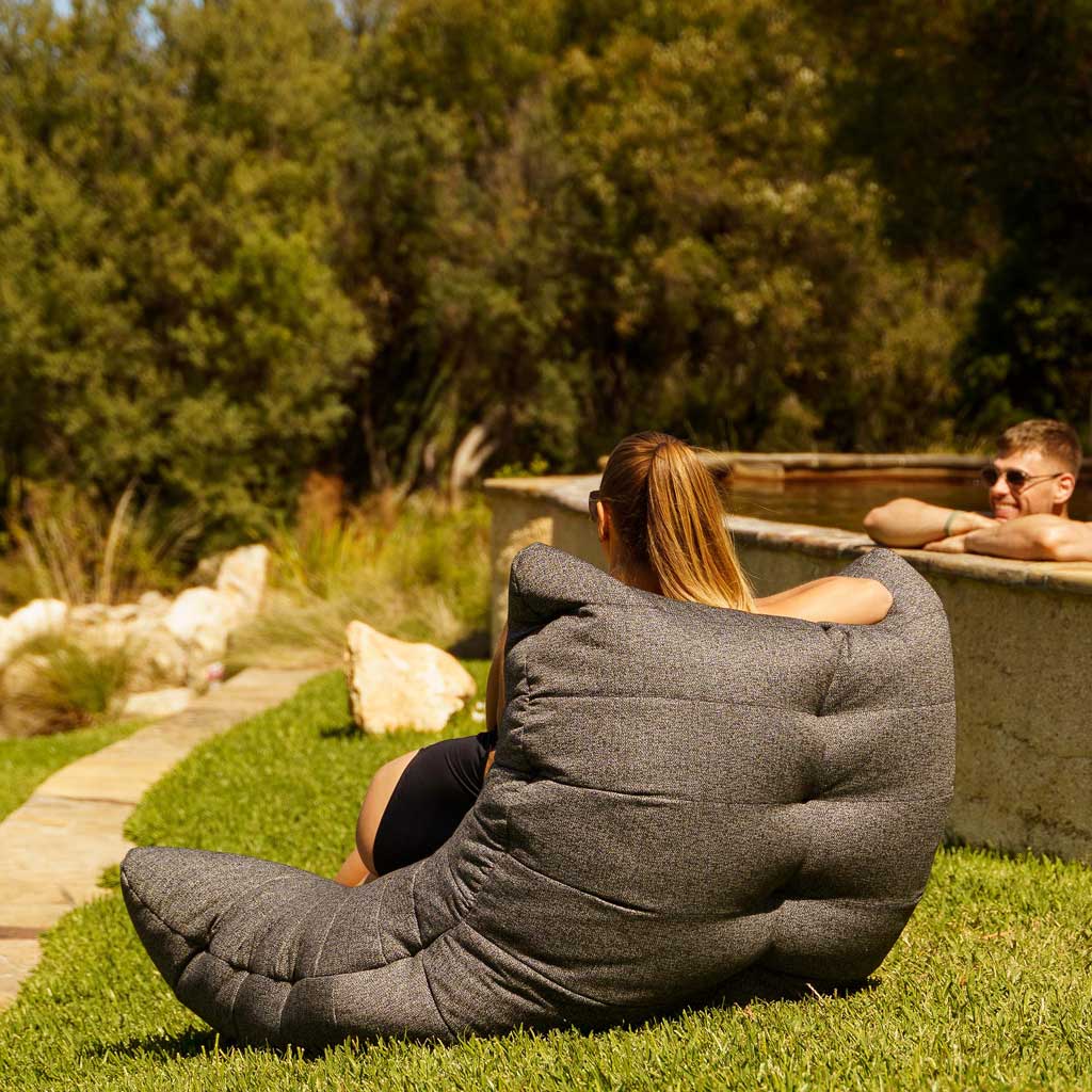 Kaunis suunnittelijan ulkokäyttöön tarkoitettu säkkituoli, jossa on rakenne, tikkaus ja lomakohteen laatutyyli.