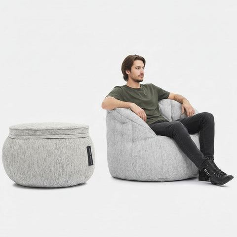 Uniikki Wing Ottoman sisältää noin 90 litraa Premium-täytettä. Wing Ottoman tulee täyttää tiukasti, jotta yläosa on kiinteä mutta tarpeeksi tasainen, jotta Memory Foam -yläosa voidaan helposti lukita vetoketjulla.
