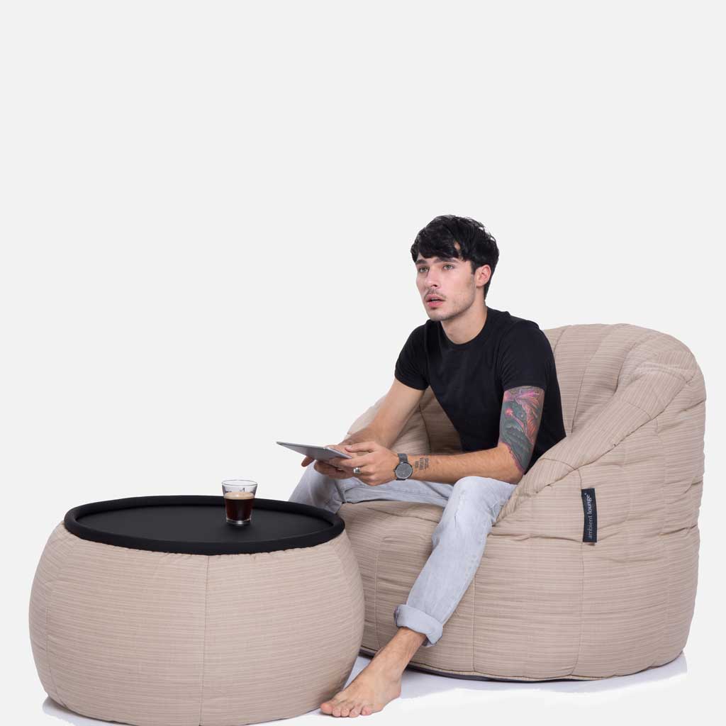 Täyttöohjeet: Huomaa ensin, että Butterfly-säkkituolissa on kaksi täyttötilaa, yksi selkänojalle ja toinen pohjalle (istuinalueelle). Suositellaan, että selkänoja täytetään tiiviisti ja istuinalue hieman löysemmin parhaan mukavuuden ja tyylin saavuttamiseksi. Käytä aina Ambient Lounge -turvalukitusvälinettä tai paperiliitintä avataaksesi lapsiturvalliset vetoketjut säkkituolin kannessa.