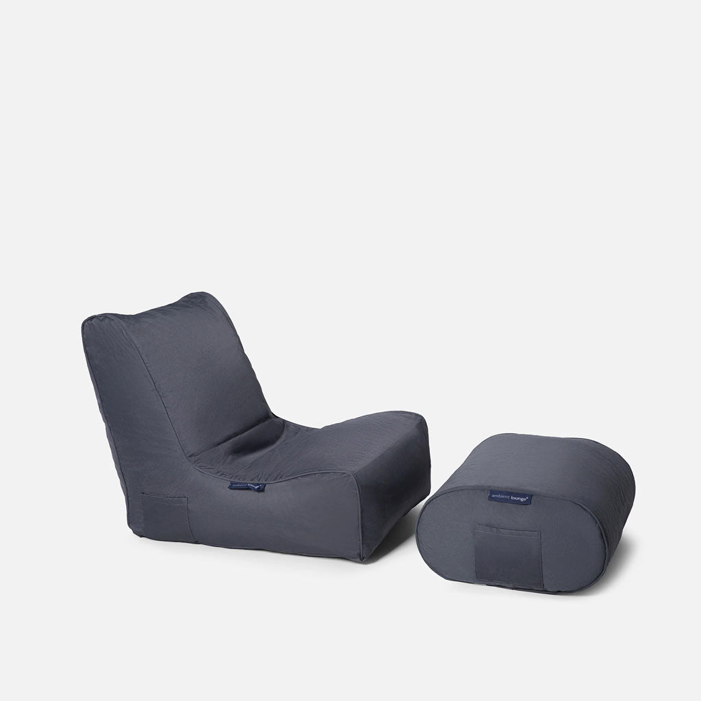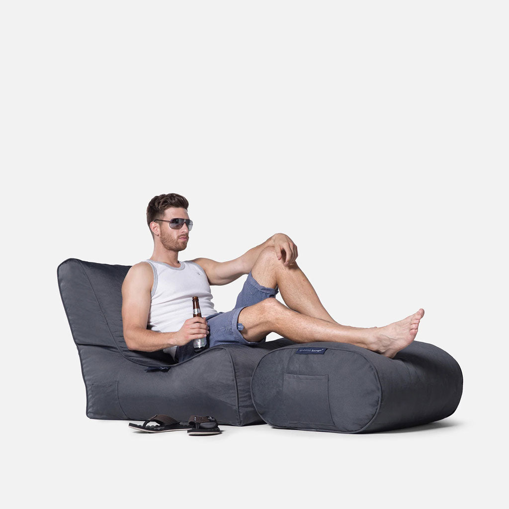 Tämä on säkkituoli, joka on suunniteltu sekä sisä- että ulkokäyttöön. Se tarkoittaa, että kangas on suunniteltu kestämään säätä ja tuulta sekä olemaan mukava istua.