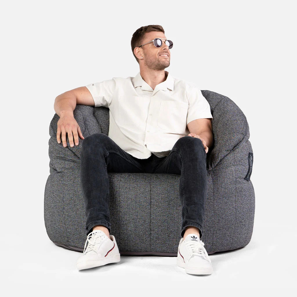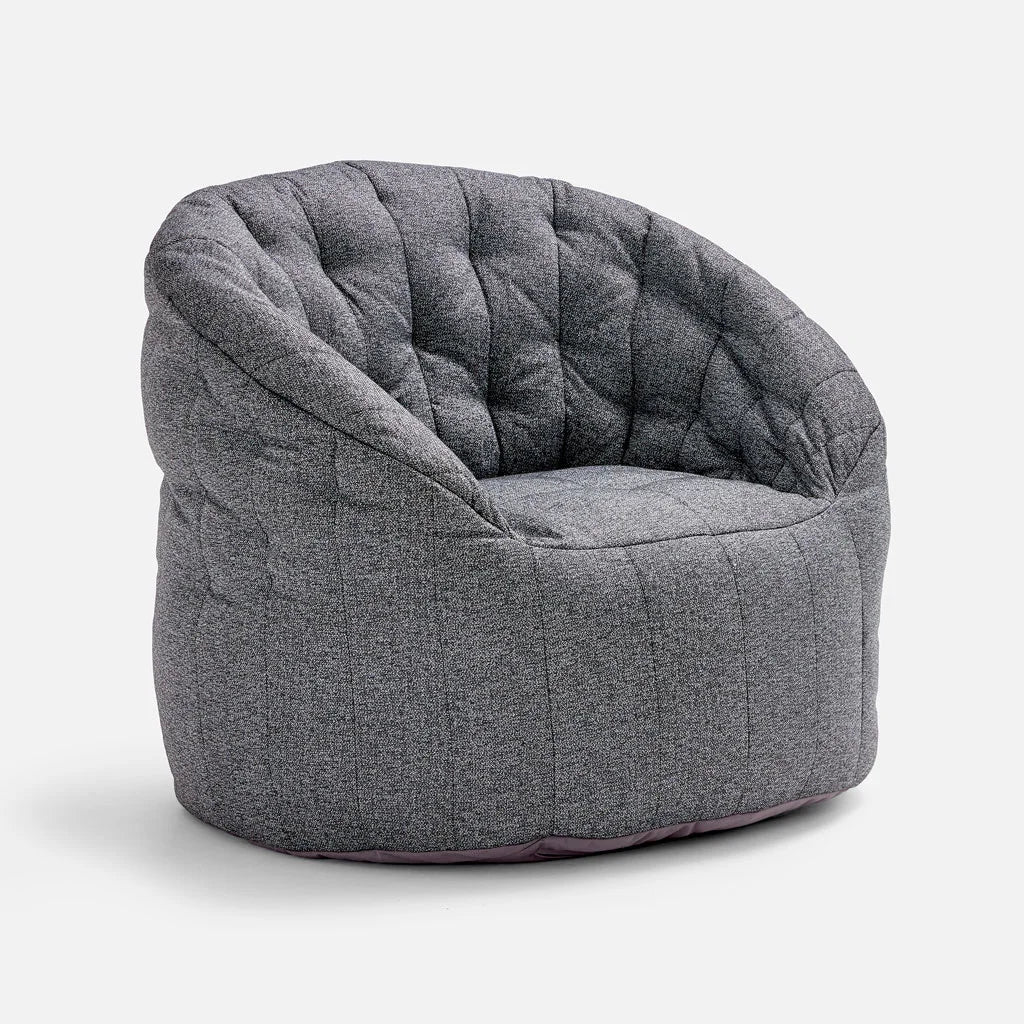 Kaunis suunnittelijan ulkokäyttöön tarkoitettu säkkituoli, jossa on rakenne, tikkaus ja lomakeskustyylinen laatu.