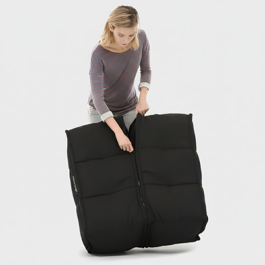 Avaa takatila ja kiinnitä täyttöpussimme turvallisesti tilaan. Avaa ja käännä ylösalaisin, jotta painovoima tekee suurimman osan työstä ja tyhjentää kaikki helmet. Täytä tila mahdollisimman tiiviisti, jotta Twin Ottoman on tukeva ja vakaa. Varmistaaksesi, että kaikki helmet ovat tiiviisti sisällä, sinun tulisi ravistaa ja 'työntää' helmiä, jotta ne pääsevät sisään ja joustavien tukien taakse. Taputtele pussin ulkokangasta, jotta pavut voivat liikkua vapaasti ja siirtyä alas osastoon. Kun se on tiiviisti täytetty (niin ettei sisälle mahdu enempää helmiä), sulje sisäpussi ja vetoketju ulkopuolella.
